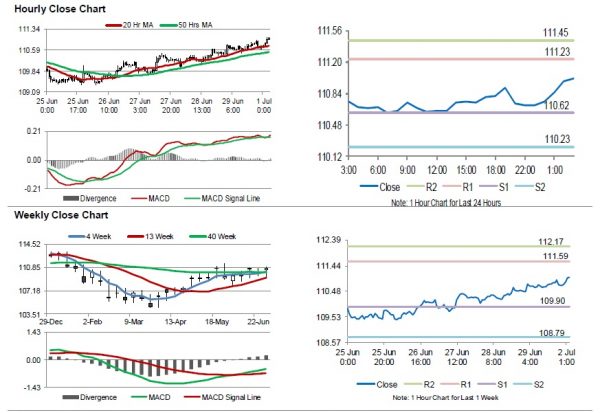 The pair is expected to find support at 110.62, and a fall through could take it to the next support level of 110.23. The pair is expected to find its first resistance at 111.23, and a rise through could take it to the next resistance level of 111.45.