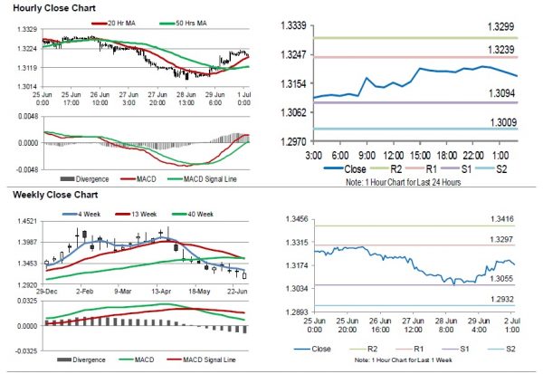 The pair is expected to find support at 1.3094, and a fall through could take it to the next support level of 1.3009. The pair is expected to find its first resistance at 1.3239, and a rise through could take it to the next resistance level of 1.3299.