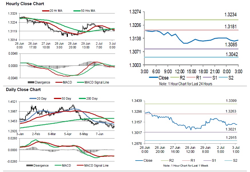 The pair is expected to find support at 1.3085, and a fall through could take it to the next support level of 1.3042. The pair is expected to find its first resistance at 1.3181, and a rise through could take it to the next resistance level of 1.3234.