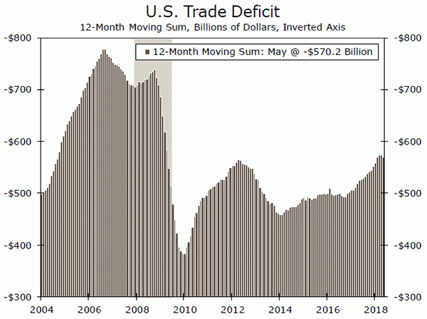 Tariffs are not included in the import price index, since they are added on later. However, recent flattening in the underlying pace of import price growth should help ease the final cost burden to purchasers of imports when tariffs are applied. Steel and aluminum tariffs were extended to the European Union, Mexico and Canada on June 1 and tariffs on $34 billion of Chinese goods took effect July 6.