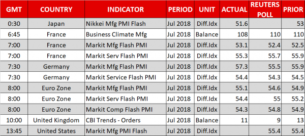 FOREX: The US dollar is showing modest losses versus most currencies. The greenback continued to weaken against the Japanese yen on Tuesday, as dollar/yen fell by 0.15%, approaching the 111.00 psychological level. The US dollar index fell marginally by 0.04%, giving back the gains that it had posted earlier in the day. Preliminary PMI survey data indicated that the eurozone economy lost momentum in July. The IHS Markit composite PMI fell to 54.3 from 54.9 in June, missing the forecast for 54.8. Also, the flash services PMI inched down to 54.4 versus 55.2 before. However, the preliminary manufacturing PMI ticked higher to 55.1 from 54.9 previously, beating expectations for a modest decline. Euro/dollar climbed by 0.07%, holding near 1.1700, while euro/yen retreated by 0.13%. Pound/dollar is trying to pare some of yesterday’s losses, jumping by 0.18% to 1.3124. The antipodean currencies were moving higher with aussie/dollar and kiwi/dollar rising by 0.24% and 0.21% respectively. Meanwhile, dollar/loonie lost some momentum (-0.12%), capped by its 20-day SMA.