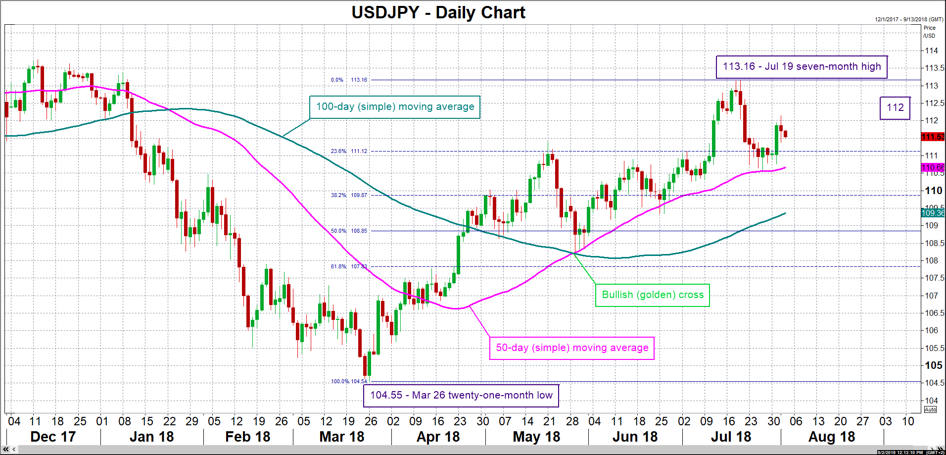 In terms of the market’s reaction to the release and focusing on USDJPY, upbeat figures, especially on the wage front, are expected to elevate the pair. Given a decisive break above the 112 round figure that would propel the pair above Wednesday’s near two-week high of 112.14, additional resistance could be met around the seven-month high of 113.16 from July 19; the area around this level also encapsulates the 113 handle. On the downside and in case of disappointing data, support may come around the 23.6% Fibonacci retracement level of the March 26 to July 19 upleg at 111.12, including the 111 mark. Further below, the attention would turn to the current level of the 50-day moving average at 110.66.