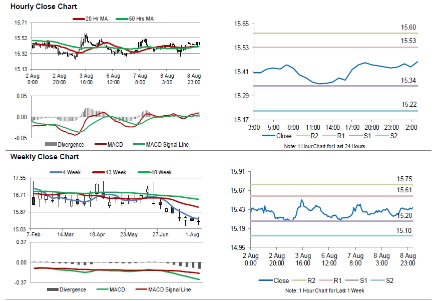 The pair is expected to find support at 15.34, and a fall through could take it to the next support level of 15.22. The pair is expected to find its first resistance at 15.53, and a rise through could take it to the next resistance level of 15.6.