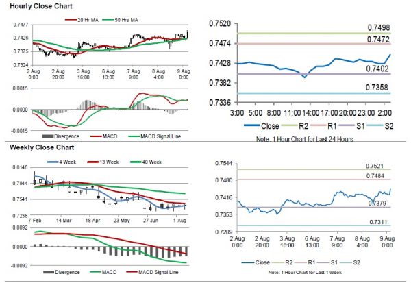 The pair is expected to find support at 0.7402, and a fall through could take it to the next support level of 0.7358. The pair is expected to find its first resistance at 0.7472, and a rise through could take it to the next resistance level of 0.7498.