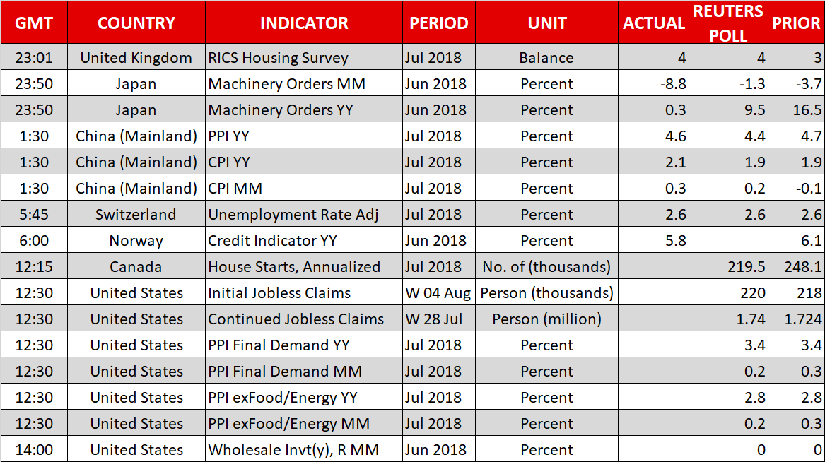 US factory price data as gauged by the producer price index (PPI) will be hitting the markets at 1230 GMT. July’s PPI is anticipated to grow by 0.2% m/m, below June’s 0.3%. This would still allow the annual pace of growth to remain at 3.4%, which was the highest since late 2011. Similar to headline PPI, core PPI that excludes volatile food and energy items is projected to ease month-on-month but remain unchanged on a yearly basis. The numbers may be seen by markets as a precursor to tomorrow’s release on consumer prices. Thus, a data beat may support the dollar, stoking expectations for two more Fed rate increases as the year unfolds, and vice versa. Additionally, weekly jobless claims figures are due out of the US at the same time, while data on June wholesale inventories will be made public at 1400 GMT.