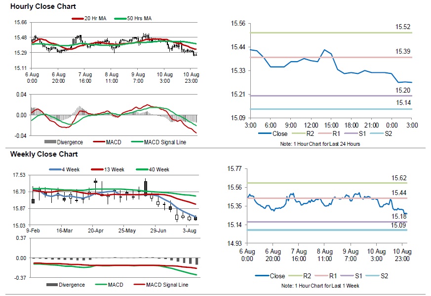 The pair is expected to find support at 15.20, and a fall through could take it to the next support level of 15.135. The pair is expected to find its first resistance at 15.39, and a rise through could take it to the next resistance level of 15.52.