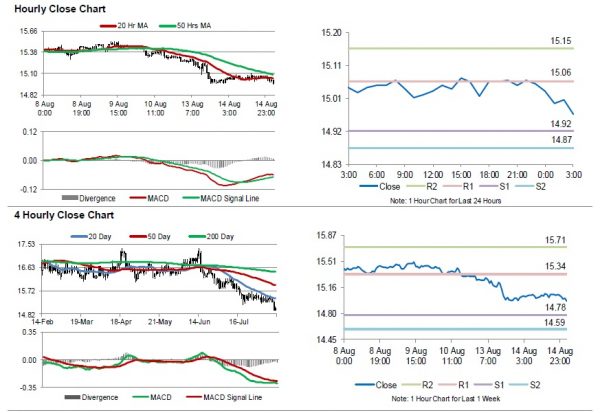 In the Asian session, at GMT0300, the pair is trading at 14.97, with silver trading 0.56% lower against the USD from yesterday’s close.