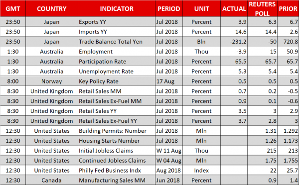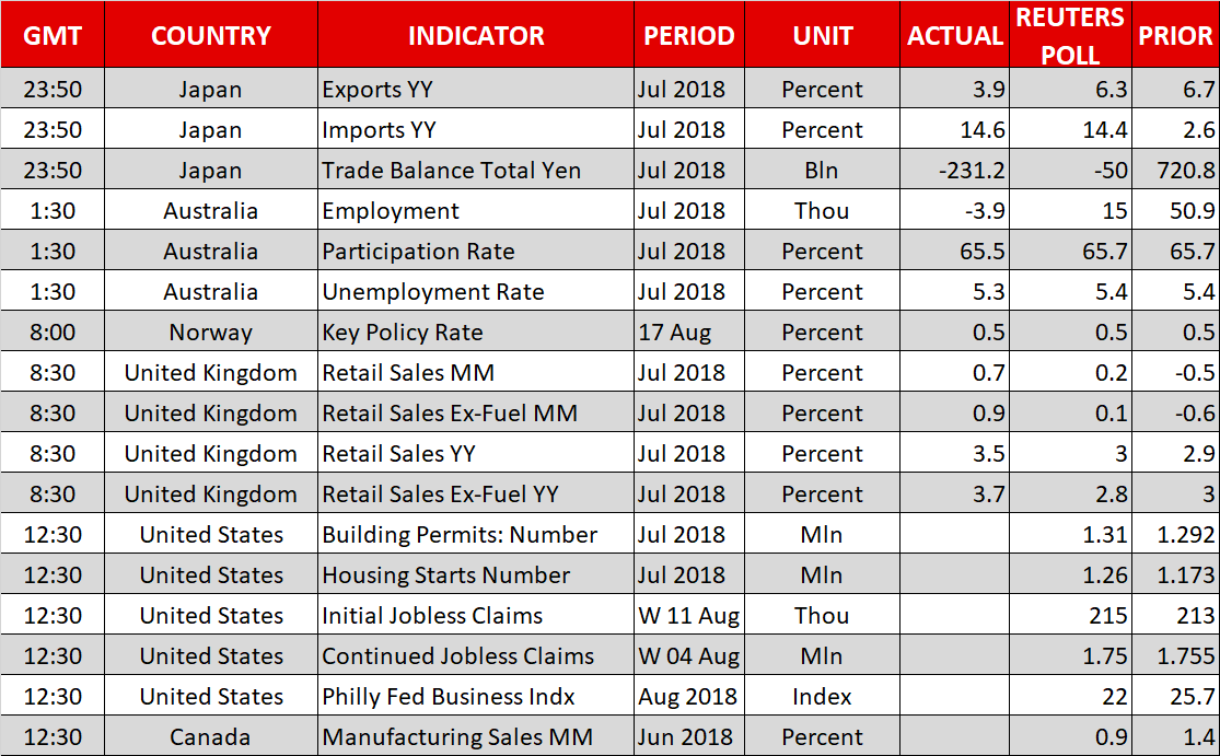 FOREX: Investors continued to look for riskier assets early in the European session on hopes that US-Sino trade tensions could deescalate following Beijing’s willingness to hold trade talks with the US later in August. Dollar/yen inched up to 110.90 (+0.15%), while the dollar index which gauges the greenback’s strength against six major currencies turned slightly lower to 96.59 (-0.11%) as trade hopes shifted some demand towards the euro. Still, trade stats out of the Eurozone showed that the bloc’s trade surplus with the US widened in June, a signal that Trump might keep adding pressure on his European counterparts. Euro/dollar strengthened by 0.25% on the day to trade at 1.1371 despite Washington refusing to remove its steel tariffs on Turkey, thereby reducing the chances for Ankara to release the American pastor. Pound/dollar failed to gain on upbeat British retail sales readings. While it stretched up to touch a high of 1.2731 after the data showed that retail sales expanded by 3.5% y/y in July compared to 3.0% expected and the 2.9% seen in June, the pair soon eased to 1.2699, near today’s opening price. In antipodean currencies, aussie/dollar and kiwi/dollar were in bullish mode, with the former changing hands higher at 0.7272 (+0.48%) and the latter crawling up to 0.6584 (+0.34%). Dollar/loonie was weaker at 1.3120 (-0.15%). The Turkish lira continued to pare loses against the greenback, sending dollar/lira down to 5.79 (-3.08%).