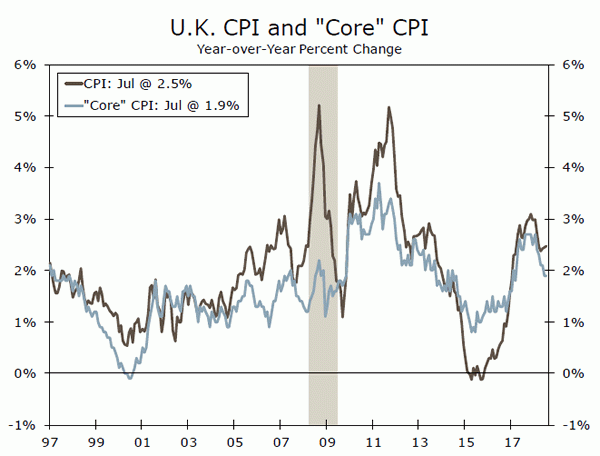 The British economy continues to show resilience, with the 0.4 percent gain in Q2 GDP (not annualized) representing a 22nd straight quarter of positive growth. That said, the economy’s advance is steady rather than strong. July retail sales rose 0.7 percent month-on-month, essentially reversing their sizeable June drop, while the employment gain for the three months to June slowed to just 42,000. Meanwhile, wage and price pressures are dissipating. Although July CPI inflation ticked up to 2.5 percent year-on-year, core inflation was steady at 1.9 percent, slightly below the Bank of England’s target, while wage growth also eased in June.