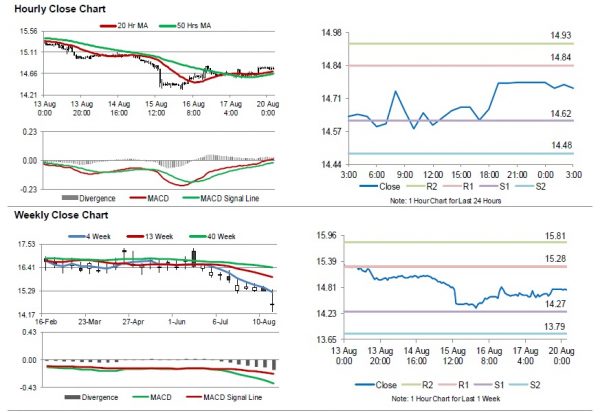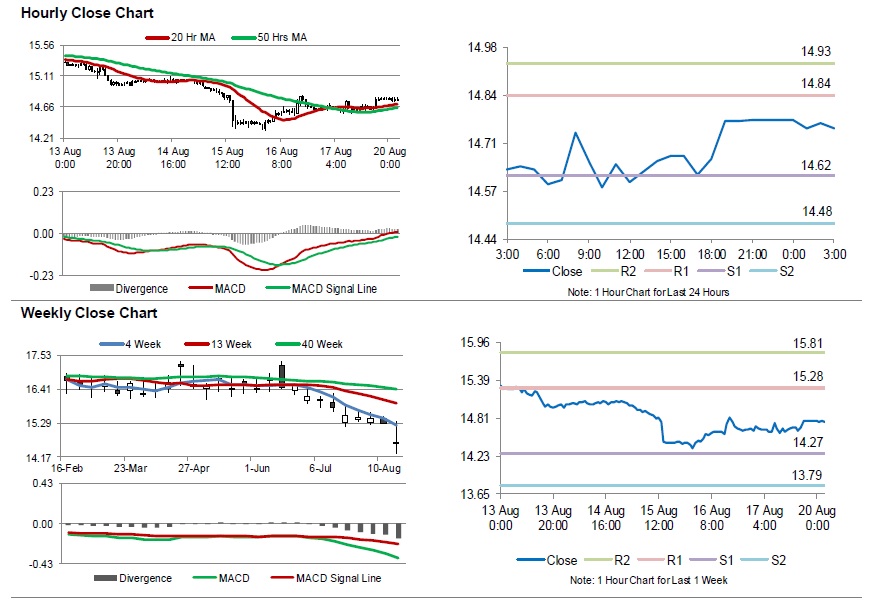 The pair is expected to find support at 14.62, and a fall through could take it to the next support level of 14.48. The pair is expected to find its first resistance at 14.84, and a rise through could take it to the next resistance level of 14.93.