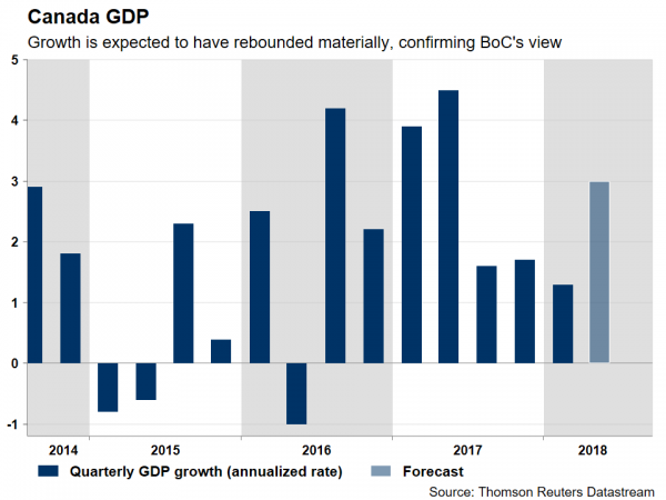 Canada’s GDP data for Q2 are slated for release on Thursday, at 1230 GMT. Forecasts point to a material rebound in economic growth, which is likely to be pleasant news for BoC policymakers, and could support the loonie somewhat. That said, the most crucial determinant of the currency’s forthcoming direction may be how the US-Canada trade negotiations play out over the coming days.