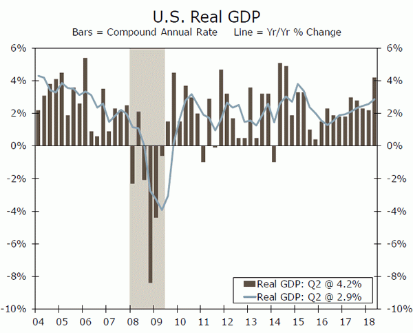 The second estimate for GDP revealed a faster pace of economic growth than first estimated, with the annualized growth rate quickening slightly to 4.2 percent in Q2. The details also offered additional color on the state of the economy at this late stage of the cycle and, with some exception, those details were broadly positive.