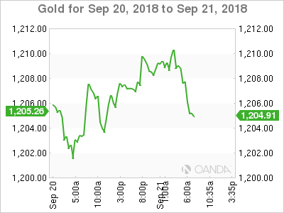 The fact that Sino-U.S trade tensions have somewhat dissipated is helping precious metal prices. Ahead of the U.S open, gold prices remain better bid on the back of a weaker U.S dollar and are heading for its first weekly gain in a month. Spot gold is up +0.3% at +$1,210.68, after touching its highest since Sept. 13 at +$1,211.02. It has rallied +1.3% so far this week. U.S gold futures are up +0.3% at +$1,215 per ounce.
