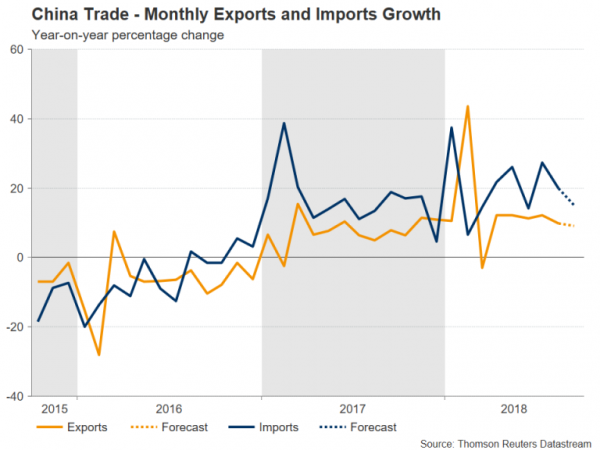 As the United States continues to pile pressure on Chinese authorities to give US companies more access to the local market, there’s been little evidence so far that the enacted tariffs by the two sides are hurting Chinese exporters. Annual growth in exports stood at 9.8% in August and is forecast to have slowed slightly to 9.1% in September. The data, due on Friday, is also expected to show imports rising by 15.0% in September, pointing to healthy domestic demand.