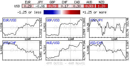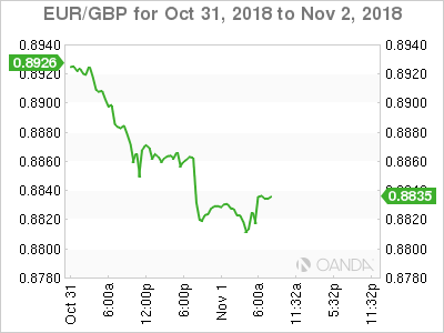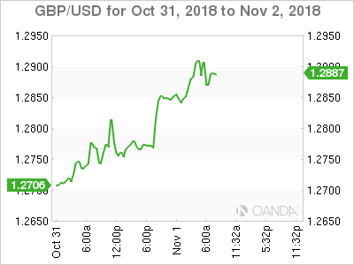 The pound (£1.2910, +1%) is higher on two apparent Brexit breakthroughs. A letter from U.K Brexit negotiator Dominic Raab to Parliament was published today that stated Nov. 21 as the possible date for an agreement with the E.U and overnight, the Times has reported that the U.K. has reached a post-Brexit deal for the financial services sector.
