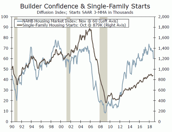 Rising mortgage rates are likely playing a role in the recent housing market slowdown. Over the past six months, sales of both new and existing homes have weakened and home prices across the country have begun to moderate. This week also presented further evidence of a housing soft patch, as the NAHB/Wells Fargo Housing Market Index showed the sharpest drop in homebuilder confidence in nearly five years. Meanwhile, mortgage purchase applications have trended lower recently, falling 1.1% over the past year on a four-week moving average basis through the week of November 16.