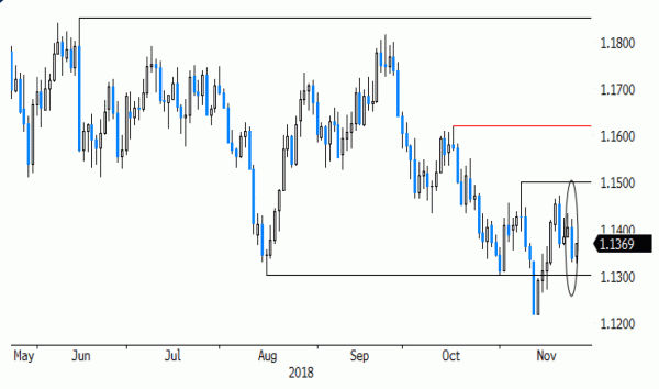 Euro weakness prevailed on Friday as the Nov. EMU PMI’s declined again faster than expected. Of late, markets questioned whether recent volatility would make the Fed more cautious to hike rates further next year. However, EMU data also raise questions whether the ECB will be able to raise rates. Sentiment on risk remained fragile and supported the dollar. Even the oil-price decline maybe was slightly USD supportive as it might ease US inflationary pressures. EUR/USD declined for most of the day and finished at 1.1337. USD/JPY closed the session little changed at 112.96. This morning, risk sentiment improves. The oil price decline is positive for several countries in Asia. The (trade-weighted) dollar is little changed (96.90 area). EUR/USD (1.1350) shows tentative signs of bottoming. The yen weakness (risk-on). USD/JPY is trading in the 113.20 area. FX-traders will keep a close eye at the German IFO business confidence today, in the wake of the poor PMI’s. ECB’s Praet will speak and ECB’s Draghi will testify before the European Parliament. We expect Draghi to mainly keep the assessment from the October meeting and ‘downplay’ recent signs of a slowdown. A constructive risk sentiment and modest optimism for Draghi might help a bottoming of the euro in daily perspective. Later this week, (FX) markets will closely monitor a speech of Fed’s Powell (Wednesday). At the end of the week, US president Trump and Chinese are expected to meet at the G20 meeting, discussing the US-China trade relations. Last week we had a neutral bias on EUR/USD. The pair is holding a sideways range between 1.1216 and 1.1621. In a short-term perspective, a further EUR/USD decline/rise of the dollar might be less evident. EUR/USD might regain some ground if sentiment or risk improves. Some progress in the US-China trade talks might be a euro positive, too. So, EUR/USD might drift a bit back north. However, for now we expect the 1.1621 resistance to hold.