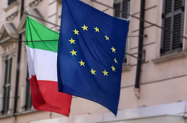 Home Italian And European Union Flag Waving In Rome Italy.Europe Italian And European Union Flag Waving In Rome Italy.Europe