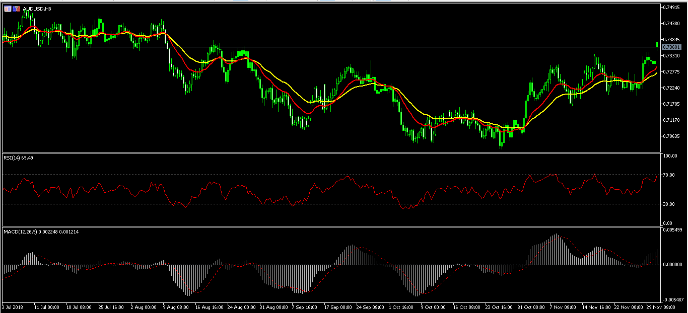 The Australian dollar rose sharply in the Asian session today. The pair reached an intraday high of 0.7380, which is the highest level since August this year. It was a continuation of a rally that started in October. The pair’s price is above the 15-day and 30-day EMA while the RSI has jumped to almost 70. The MACD too has moved above the neutral line. Therefore, it is likely that the upward rally will continue