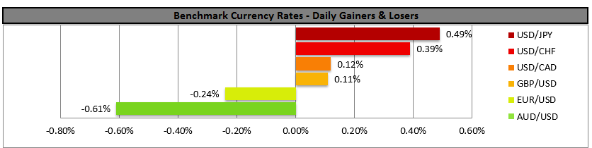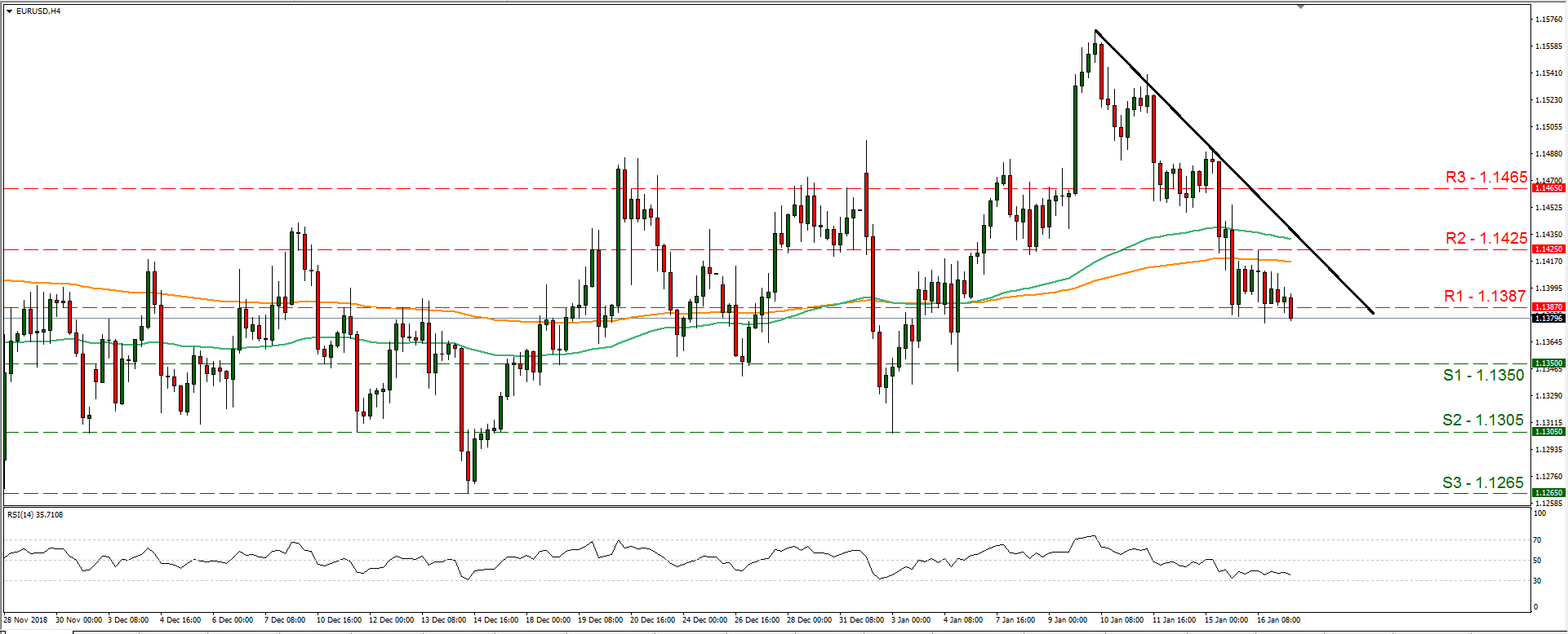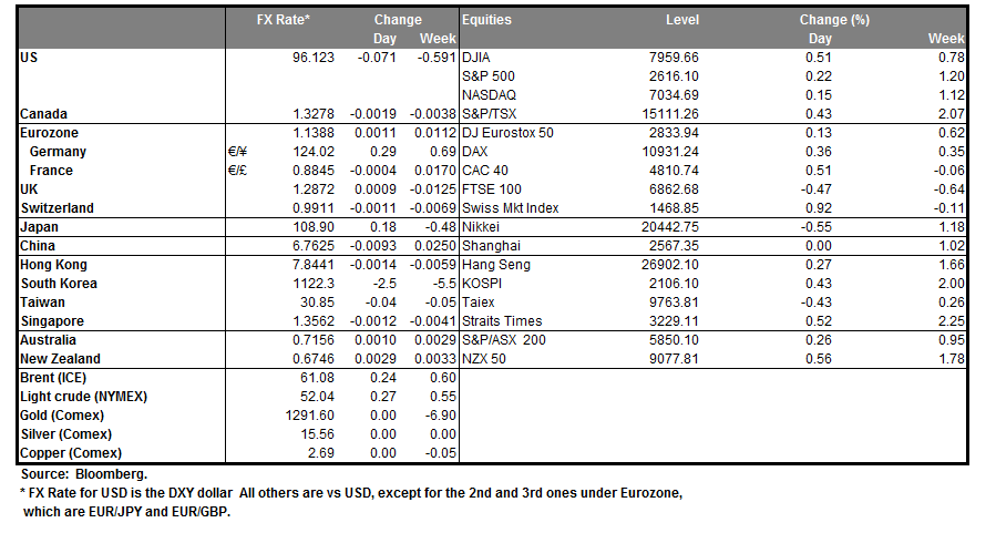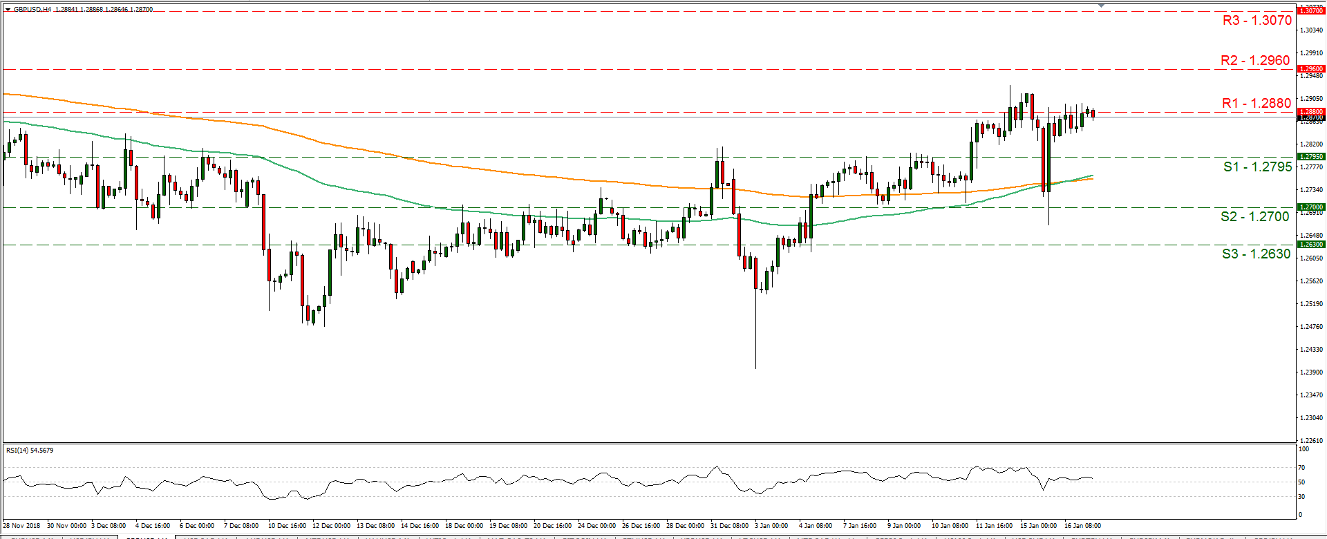 The USD remained steady yesterday against a number of its counterparts, after gains made in previous sessions especially against the EUR. Persistent worries about the Eurozone economy seem to weigh on EUR/USD and financial releases as well as ECB official’s statements seem to strengthen arguments for a bearish market of the pair. Across the Atlantic, the US government shutdown seems to remain the main theme and may have started to take its toll on the economy, however analysts point out also that the Fed’s rate hike cycle could be approaching its end and some even are mentioning possible rate cuts. Never the less, a possible rate cut this year, currently seems as a remote scenario in our view, for the time being. Please be advised, that in a recent report the Fed had indicated that US businesses have become less optimistic in recent months and we see the case for the conclusion to strengthen Fed’s recent comments about “patience” on interest rate hikes. EUR/USD maintained a rather sideways movement yesterday, continuously testing and finally breaking during today’s late Asian session, the 1.1387 (R1) support line (now turned to resistance). We maintain the view of a bearish market for the pair, as a downward trendline is forming since the 10th of January and consecutive lower peaks appear on the 11th and 15th of January. For our view to change, we would require the pair’s price action to clearly break the prementioned downward trendline. Should the bears continue to dictate the pair’s direction, we could see the pair breaking the 1.1350 (S1) support line and aim for lower grounds. Should on the other hand the bulls take over, we could see the pair breaking the 1.1387 (R1) resistance line and aim for the 1.1425 (R2) resistance barrier.