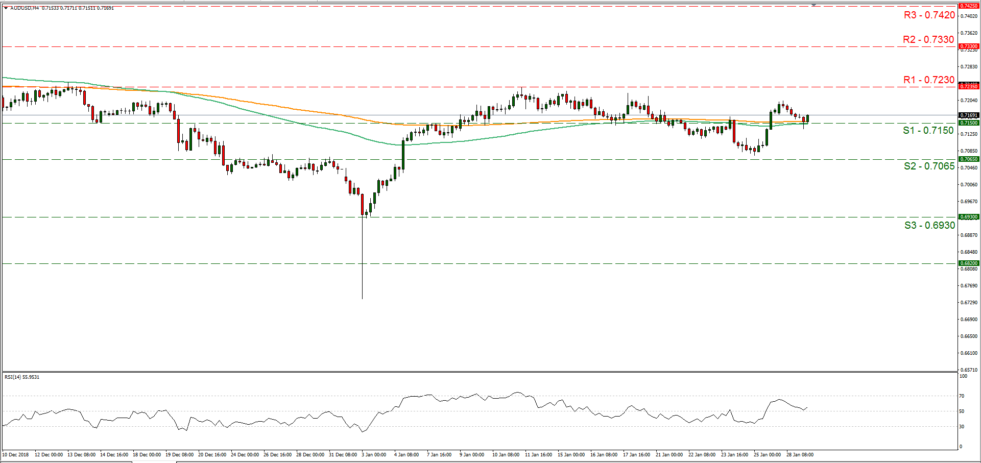 The US on Monday pressed charges against Huawei, its chief financial officer and two affiliates with bank and wire fraud to violate sanctions against Iran. According to media China has expressed serious concerns about the US charges against Huawei and the Chinese foreign ministry stated that Beijing would protect the lawful interests of Chinese companies. The escalation of the case, which has already increased tensions between the two countries (and Canada) may threaten the imminent US-Sino trade negotiations this week. Analysts point out that, after the US pressing charges on Huawei, there may be much less of a chance for the US-Sino negotiations to produce positive results. We see the case for any possible negative effects to hit the equity markets and the AUD, while on the other hand it could support safe haven assets like JPY. AUD/USD retained a range bound movement yesterday and during today’s Asian session, testing the 0.7150 (S1) support line. We could see the pair maintaining its sideways movement, yet we retain reservations for a possible bearish outlook for the pair as the fundamentals could be may not favor the AUD side. Should the pair come under the selling interest of the market, we could see it breaking the 0.7150 (S1) support line and aim for the 0.7065 (S2) support barrier. Should the market favor the pair’s long positions, we could see the pair breaking the 0.7230 (R1) resistance line and aim for higher grounds.