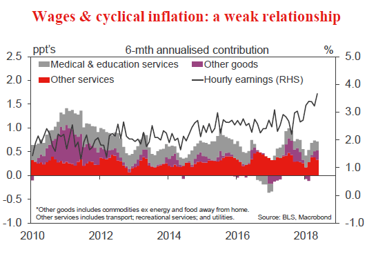 To our mind however, this would be a mistake. In six-month annualised terms, core inflation has already decelerated to a 2.0% pace over the December quarter. And, looking ahead, the trends in its key components point to inflation remaining around the current level. Most interesting in this detail is the absence of a link between wages and inflation for cyclical goods.