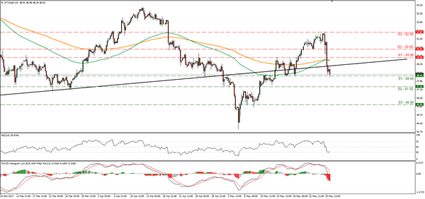 WTI fell below two support (now turned into resistance) levels in a row and the longer-term upside support line taken from the low of the 5th of April 2016. The decline was halted near the 48.40 (S1) support level. Even though the price structure on the 4-hour chart suggests the near-term outlook is cautiously negative, in order for us to get confident on further declines, we would like to see a decisive break below the 44.00 zone. Such a break would signal a forthcoming lower low on the 4-hour chart, and may set the stage for further downside extensions.