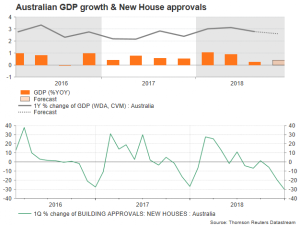 After slowing for two consecutive quarters, Australian GDP growth is said to have inched up by 0.1 percentage points to 0.4% quarter-on-quarter in the last three months of the year to December. In yearly terms though, expansion is expected to have flipped back to 2.6% from 2.8% in Q3 and down from the strong 3.4% increase registered in Q2, ending the year almost where growth was at its beginning.