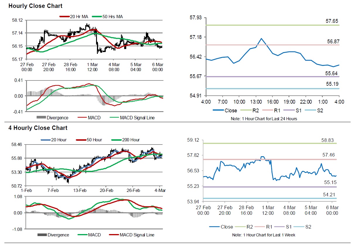 The pair is expected to find support at 55.64, and a fall through could take it to the next support level of 55.19. The pair is expected to find its first resistance at 56.87, and a rise through could take it to the next resistance level of 57.65.