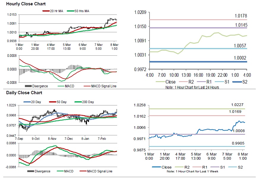 The pair is expected to find support at 1.0057, and a fall through could take it to the next support level of 1.0002. The pair is expected to find its first resistance at 1.0145, and a rise through could take it to the next resistance level of 1.0178.