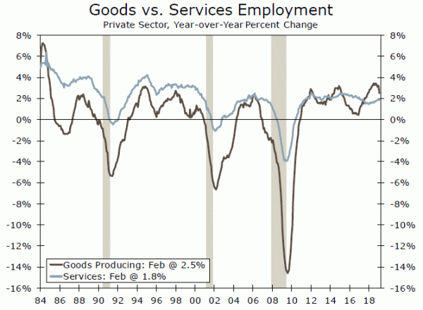 The return of more typical winter weather after a mild January and slowing growth overseas took a toll on hiring in the goods sector (down 32K). Construction payrolls fell 31K, mining was down 5K and manufacturers added the fewest jobs in about a year and a half (+4K). Service sector hiring also slowed (+57K vs. 194K average the previous three months).