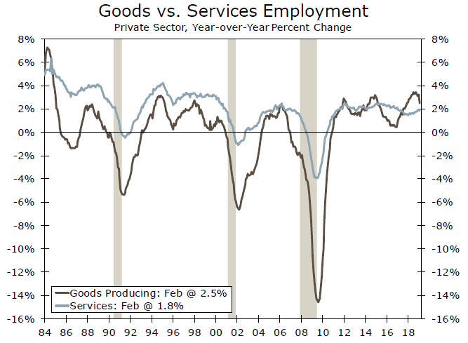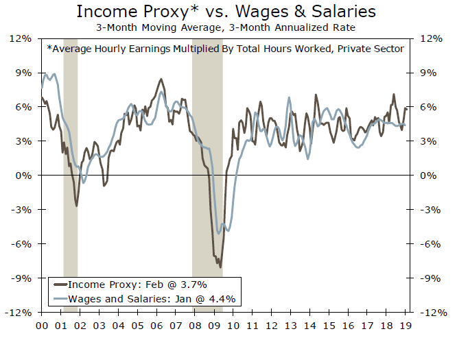 Despite the slowdown, job growth remains strong enough for the labor market to continue tightening and put upward pressure on wages. Average hourly earnings rose 0.4% in February. While the gain might be somewhat exaggerated by the small number of new hires (who start at lower wages), earnings are up 3.4% over the past year, a new cycle high. With wage growth strengthening and more workers collecting a paycheck, income growth is holding up fairly well (middle chart). We look for consumer spending to remain solid as a result and mitigate the impact of slowing investment on GDP growth.