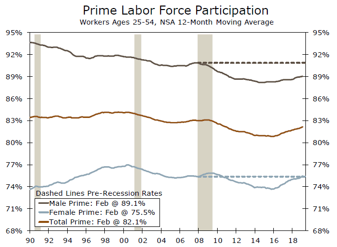 The unemployment rate declined two ticks to 3.8% last month, lowered in part by previously furloughed federal workers being back on the job last month and no longer counted as unemployed. The drop in unemployment leaves the unemployment rate within its recent range. The prime-age (25-54) labor force participation rate is still up 0.4 points over the past year, which has helped to arrest the downward trend in unemployment even as job growth has been robust. The additional pool of labor has given the FOMC one more reason to be “patient” with further policy tightening.
