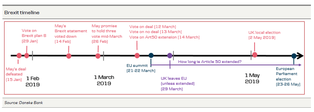 - Overall, it seems like we will get a long extension or May’s deal will pass soon. We still think May’s deal passing is the most likely final outcome and a second EU referendum (after a long extension) is the second most likely final outcome.