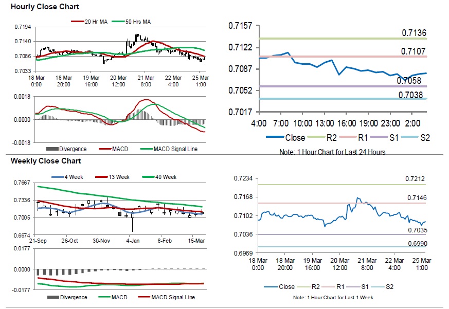For the 24 hours to 23:00 GMT, the AUD declined 0.41% against the USD and closed at 0.7081 on Friday.
