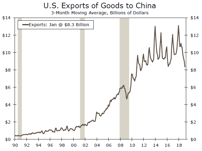 Exports increased $1.9 billion, retracing a little less than half of the $4 billion drop in December. Most of the gain came on the goods side. The biggest major category increase was food and beverage exports, which shot up 13.1% in January. Within that category, the big mover was once again soybeans. The $910 million increase was roughly eight times larger than the second biggest mover (nuts were up $118 million) and brings the category to $1.2 billion in the month—a roughly four-fold increase from December levels. Tempting though it may be to conclude that this is a China effect, we cannot be sure. In fact, U.S. exports to China fell slightly in January; the big narrowing in the trade deficit with China was entirely a function of shrinking imports from that country.
