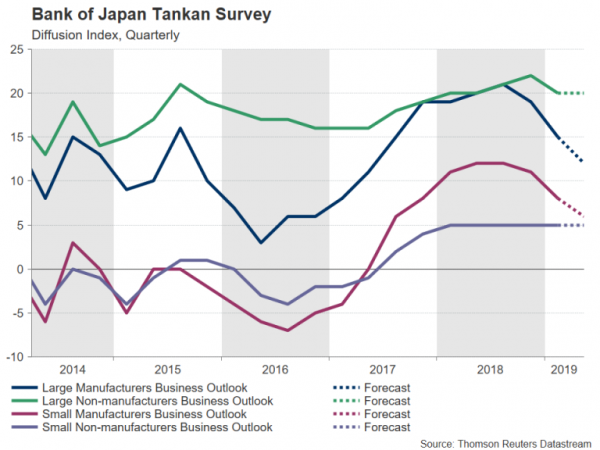 The BoJ’s own survey – the Tankan – should provide policymakers and investors some clues as to how businesses performed in the first quarter and their outlook for the upcoming quarter. The report out on Monday is forecast to show confidence falling across all sectors of the economy in Q1. But for the second quarter, although manufacturers are expected to become more pessimistic, non-manufacturers will likely signal sentiment holding steady. A bigger worry, though, could be their capital spending plans. Both big and small firms are forecast to report a drop in capital expenditure in Q2, which would point to slower GDP growth.