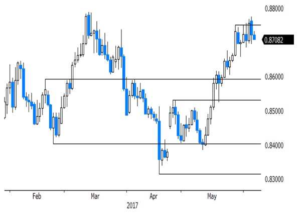Yesterday morning, sterling trade went into the defensive after the terrorist attack in London. However, the losses were modest and sterling soon returned to levels last seen at the end of the previous week. The UK services PMI declined more than expected from 55.8 to 53.8, but the report was largely ignored as an important factor for sterling trading. Quite the reverse, in technical trade, the UK currency even regained ground gradually later in the session. EUR/GBP closed the session at 0.8721. Cable finished the day at 1.2904.
