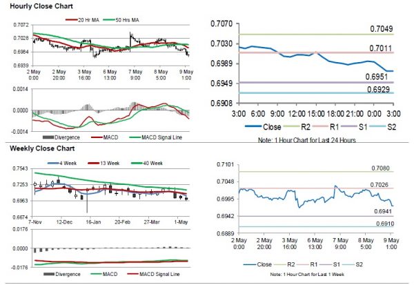 The pair is expected to find support at 0.6951, and a fall through could take it to the next support level of 0.6929. The pair is expected to find its first resistance at 0.7011, and a rise through could take it to the next resistance level of 0.7049.