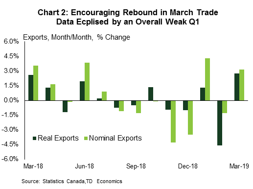 - Canadian international trade bounced back to life in March. Unfortunately, this was eclipsed by substantial downward revisions to the prior month, resulting in an overall poor Q1.