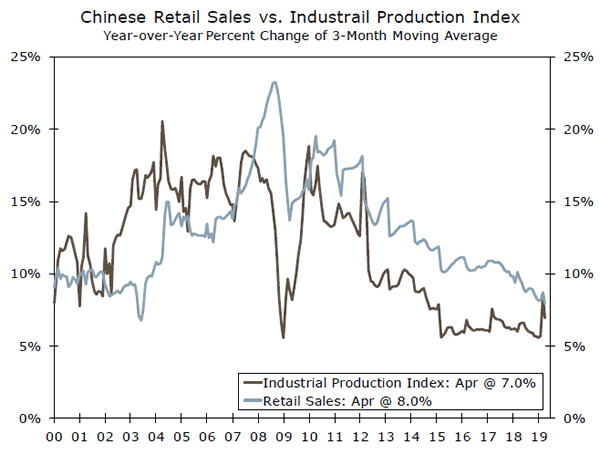 While existing tariffs have not had a material impact on the Chinese economy, Chinese economic data released this week underperformed expectations. Chinese industrial production in April increased 5.4% year-over-year, missing consensus forecasts of 6.5%, while retail sales rose only 7.2% year-over-year, also softer than expectations for an increase of 8.6%. China’s weaker-thanexpected economic activity data have renewed concerns that global GDP growth may be decelerating more quickly than previously forecasted. Should the United States move forward with 25% tariffs on all of China’s exports, we would expect a more pronounced impact on global GDP growth, as well as China’s domestic growth trajectory.