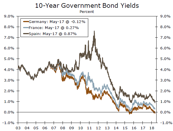 But lower government bond yields have not been confined solely to the United States. The yield on the 10-year German government bond fell to its lowest level in nearly three years this week (middle chart). Indeed, yields on German government bonds are negative out through the 10-year maturity. Yields on many other European sovereign bonds fell to multi-year lows this week as well.