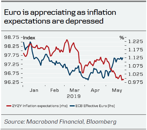 Since the end of 2018, market-based inflation expectations have deteriorated markedly. The decline has intensified over the past few weeks. The 5Y5Y and 2Y2Y inflation swap is trading close to an all-time low. As the ECB has previously stepped up its policy stimuli when inflation expectations declined from much higher levels, markets have recently been speculating increasingly about the next stimuli measure. Most prominently, the inflation expectation for the 5Y5Y was just below 2% when Mario Draghi warmed up to do QE in August 2014, which is well above the 1.32% at the time of writing. However, as growth and realised spot inflation are still holding up, we find new stimuli measures premature. Should further stimuli be needed in a risk scenario, we expect the ECB to restart QE (see Guns (and not bazookas) dominate ECB’s crisis arsenal, 9 January).