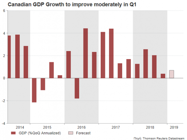 After recording the smallest expansion of 0.4% in more than two years in Q4, the Canadian annualized GDP growth is expected to have inched up to 0.7% q/q in the first three months of this year. While such an outcome would still undershoot the two-year average of around 2.4%, investors could raise their confidence in the economy as the continued jobs growth and further improvement in average hourly earnings shows that economic weakness in previous quarters was likely temporary.