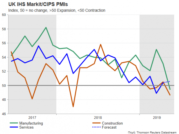 The past four weeks have been the hardest so far this year for the British pound but also for UK manufacturers, the IHS Markit/CIPS readings showed on Monday. According to analysts, the survey for the services sector might bring better results on Wednesday at 0830 GMT. Still, the outcome may not be very pleasing, reflecting the disruptions from the Brexit paralysis.