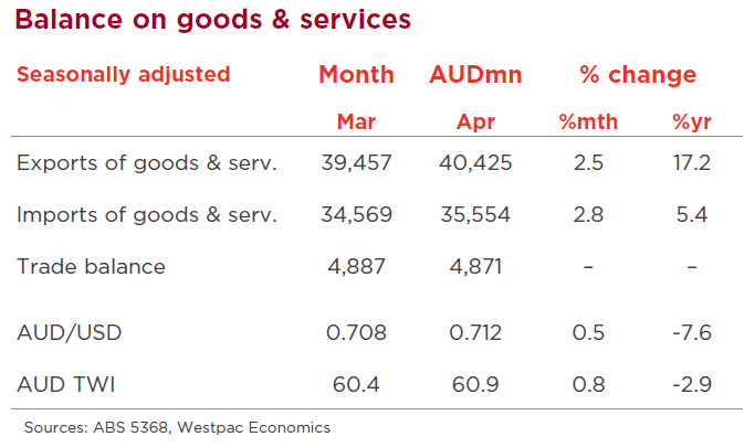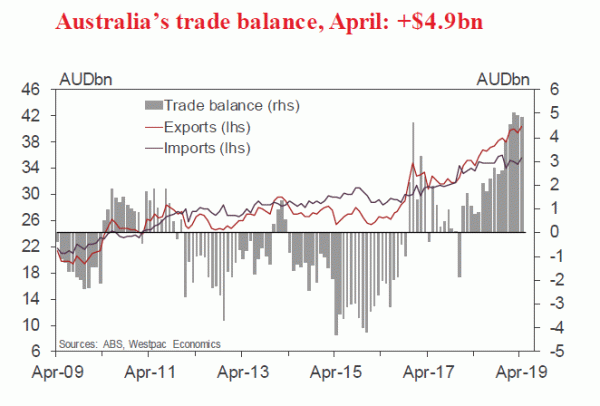 - In April, Australia’s trade surplus printed at $4.9bn, unchanged from March and only a fraction below the record high of $5.0bn in February.
