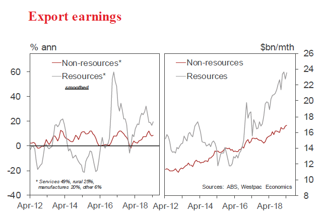 In other export detail for April: gold rose, up by $0.3bn, lifting from a relatively low base; coal disappointed, down $0.7bn; and fuels (including LNG) also moderated, down $0.2bn In the March quarter, export volumes resumed their upward trend, advancing by 1.0%. That follows a disappointing second half to 2018, when export volumes slipped by 0.5%, dented by the impacts of the drought and supply disruptions in the resources sector. Looking ahead, LNG shipments have further upside as new capacity comes on stream and the lower dollar, as well as strong demand from the Asian region, is driving strong growth in service exports, with volumes up 6.6% over the past year.