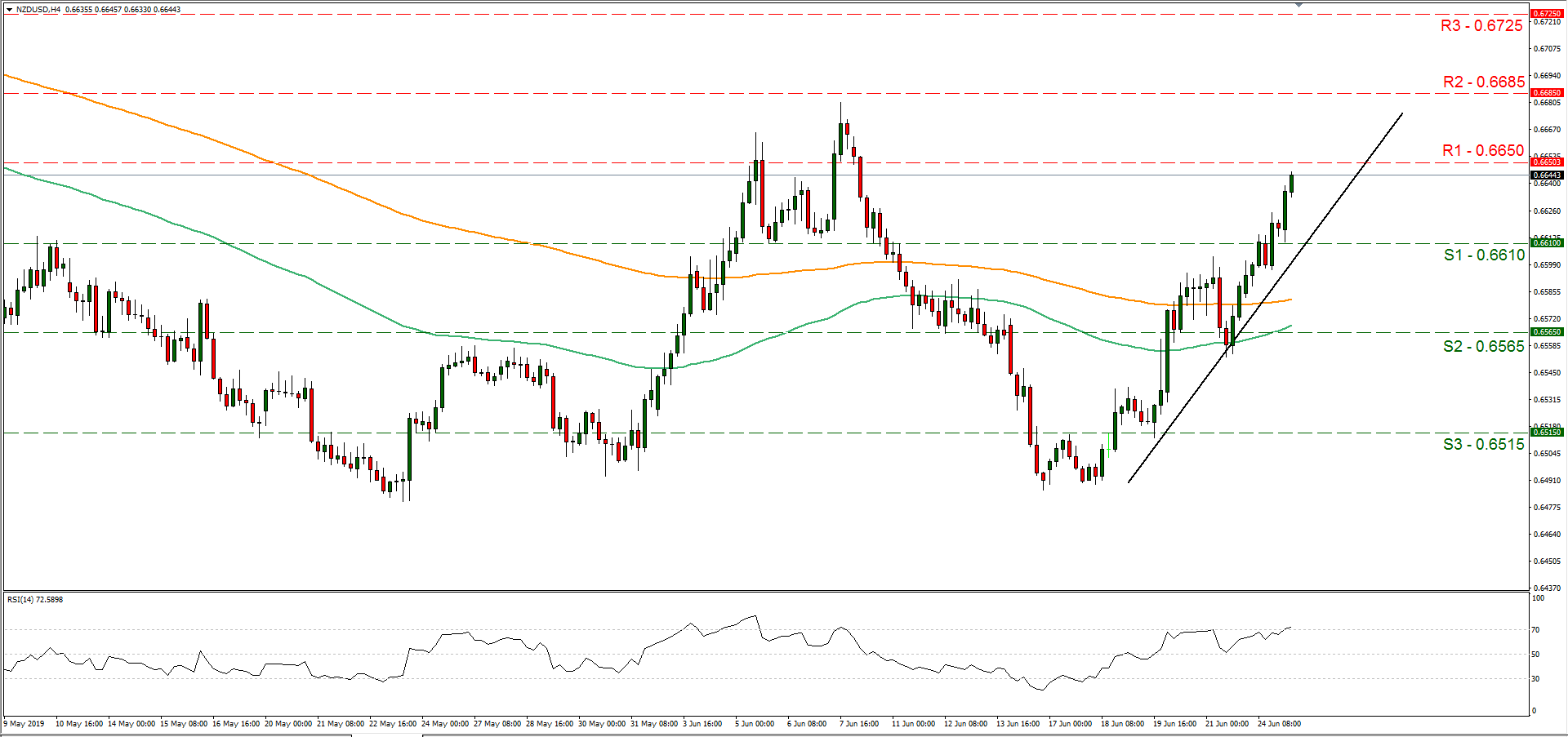 NZDUSD has been steadily climbing since the 18th of June. The RSI indicator is our 4 Hour chart is just above the 70 level and could be sending the message of an overloaded buying momentum that could be looking to make a correction. However, for the time being, the Loonie is trading between our (R1) 0.6650 resistance level and our (S1) 0.6610 support level. If the loonie continues to rise we could see it break above the (R1) 0.6650 resistance level and aim for the (R2) 0.6685 resistance level. If the pair is to move even higher we could see the next stop being at 0.6725 (R3) resistance level. In the contrary, if the pair is to correct lower the most probable stops could be the (S1) 0.6610 and even lower the (S2) 0.6565 and the (S3) 0.6515 support lines. Please be advised the pair may come under volatility upon RBNZs Interest rate decision tomorrow.