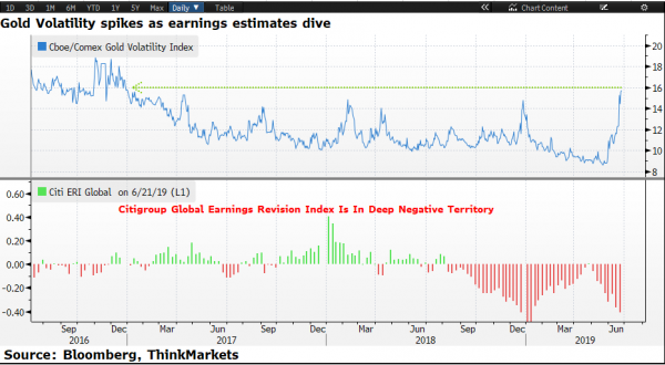 However, the recent rise in the gold volatility index is primarily due to on-going trade war between the US and China and the fact the picture doesn’t look so bright for the upcoming earning season. A large number of investment banks have already downgraded their earning expectations. The below chart shows a spike in the gold volatility and the lower panel shows the Citigroups global earnings revision index which is in deep negative territory. This confirms a pessimistic outlook.