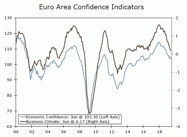 Uncertainty regarding trade has also likely weighed on consumer confidence in recent months. But the slower job growth in May was also likely a factor in the weakness. While the labor market is still hot by most measures, it is not as strong as it was according to measures of consumer confidence. The jobs plentiful index has rolled over in recent months, and is worryingly reminiscent of what we have seen late in prior cycles. The job opening rate and small business hiring plans have also come down slightly, though they too remain high. It is possible that businesses are holding off on hiring until trade tensions dissipate. But if these patterns hold, job growth could slow in coming months, something the Fed is likely monitoring. Despite uncertainty, spending data have fared slightly better. Personal consumption rose 0.4% in May, following an upwardly revised 0.6% in April and suggest personal consumption expenditures are on track to come in north of 3.0% in the second quarter. Inflation fared better as well, with the PCE deflator rising 1.6% on a year-ago basis in May. Even despite the modestly firmer footing in Q2 inflation, data this week are unlikely to dissuade the Fed from cutting rates later this year.